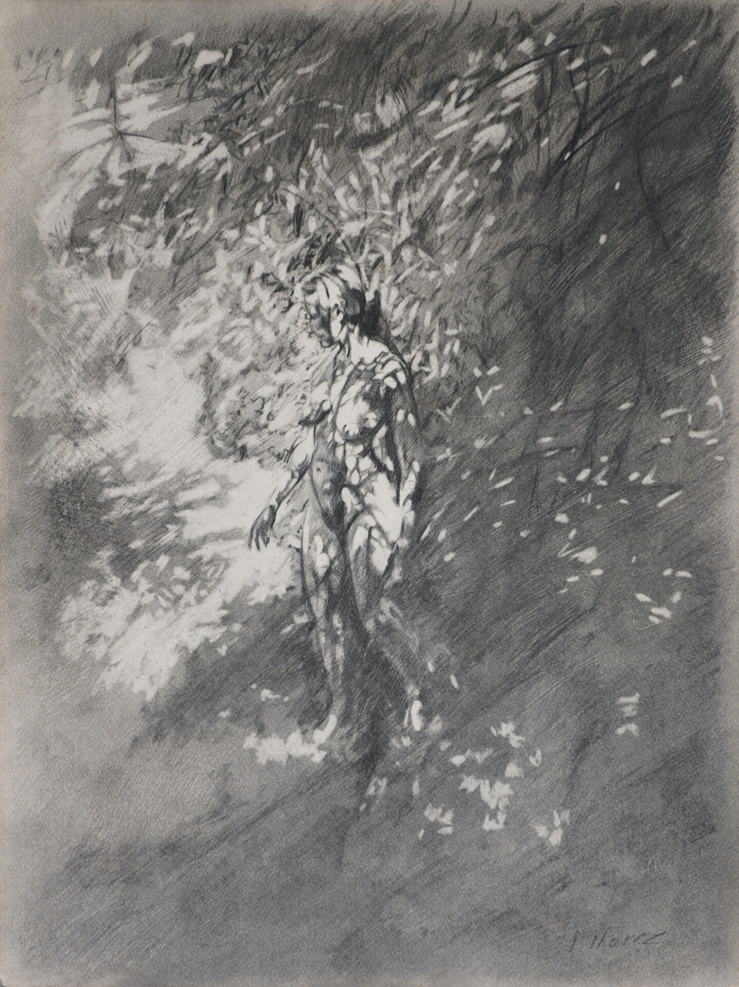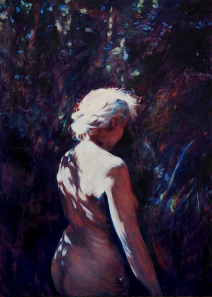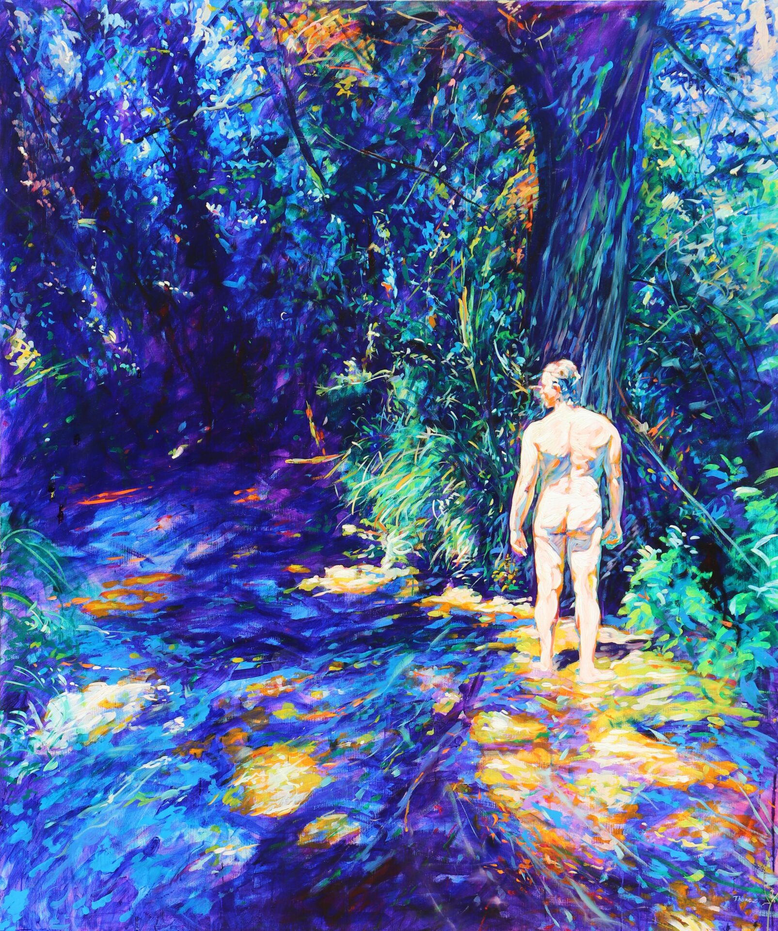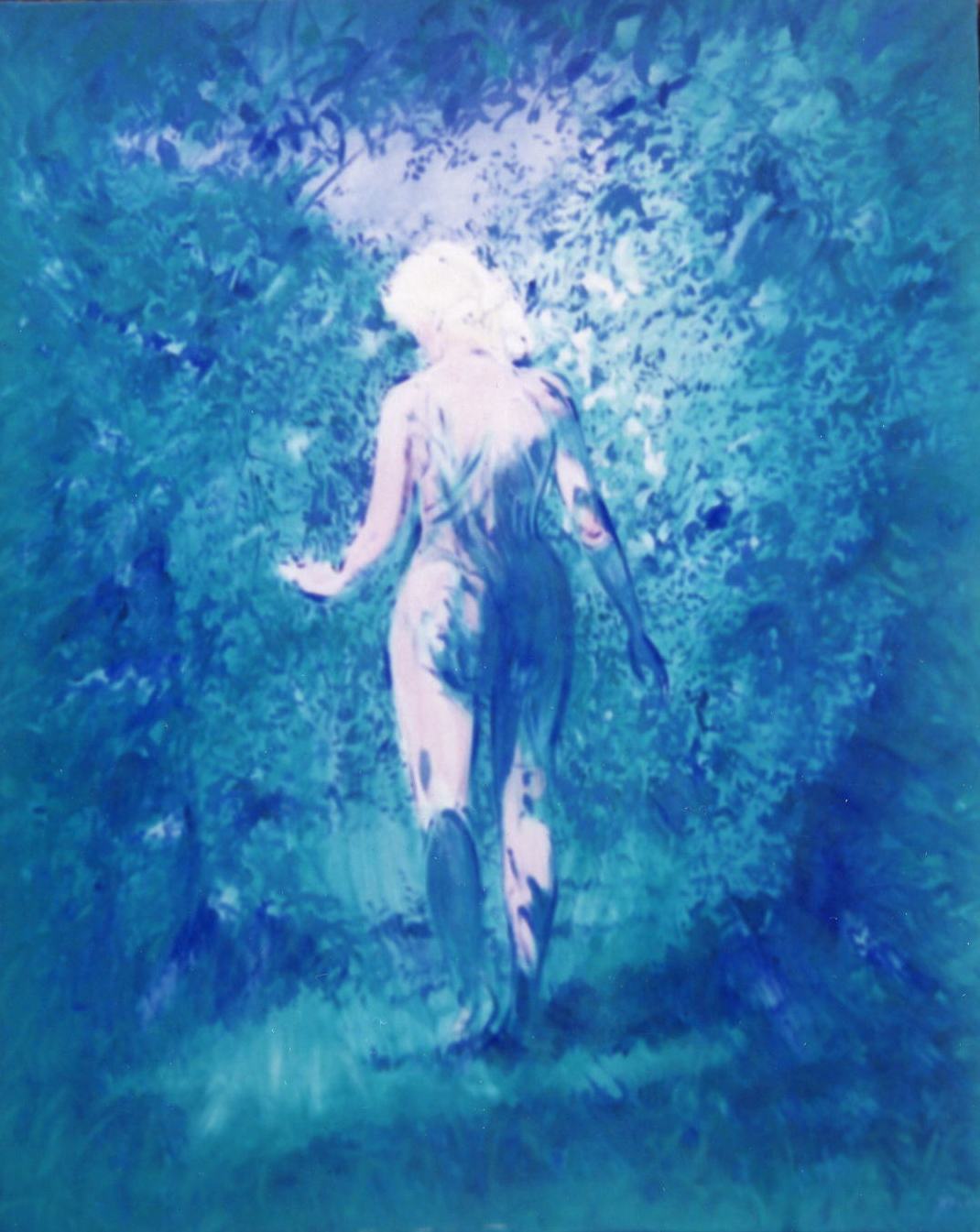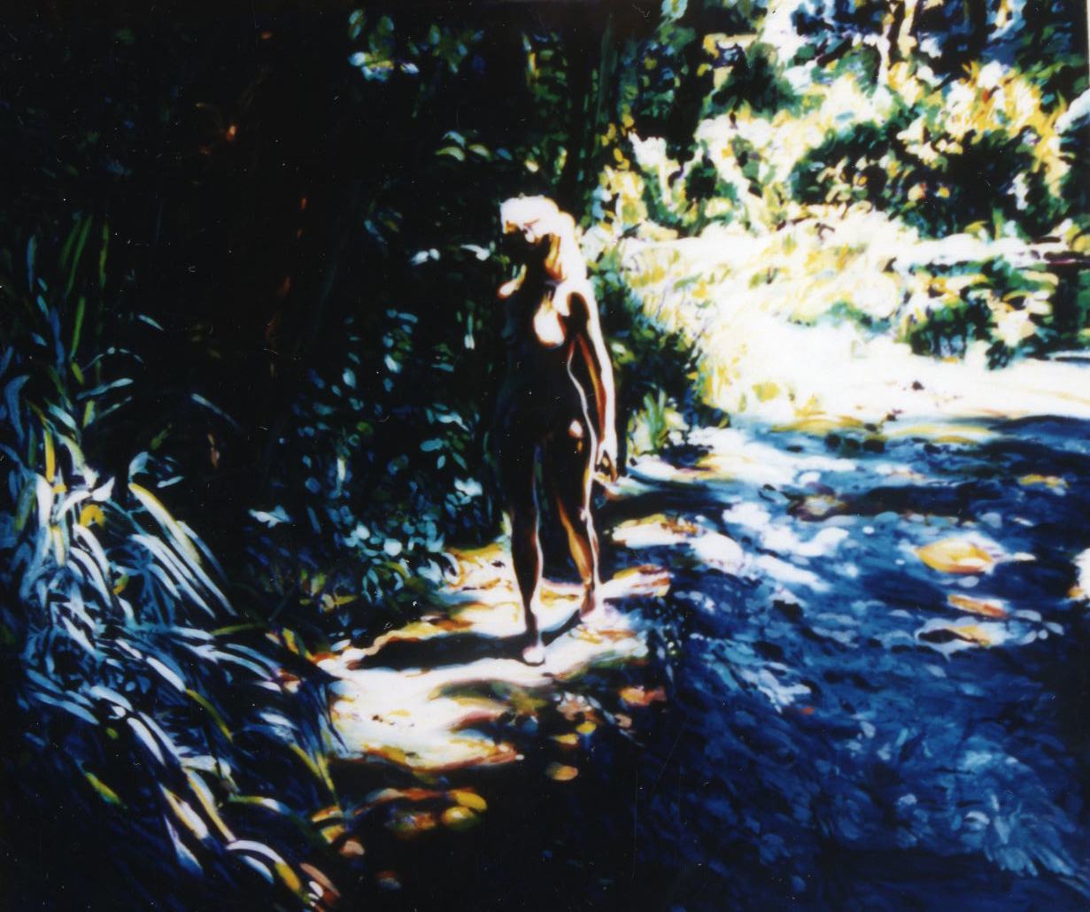 EDEN ou l’âge adamique. Tenter d’évoquer, de peindre des êtres humains dans leur intégrité, en pleine nature qui aucunement seraient en rupture. Mais au contraire par l’indifférenciation fusionnés à l’environnement naturel. Créatures dans la création, simplement manifestations du vivant. Participant d’un temps suspendu, de l’éternité paradisiaque… ceci pourrait tenir du Sacré.