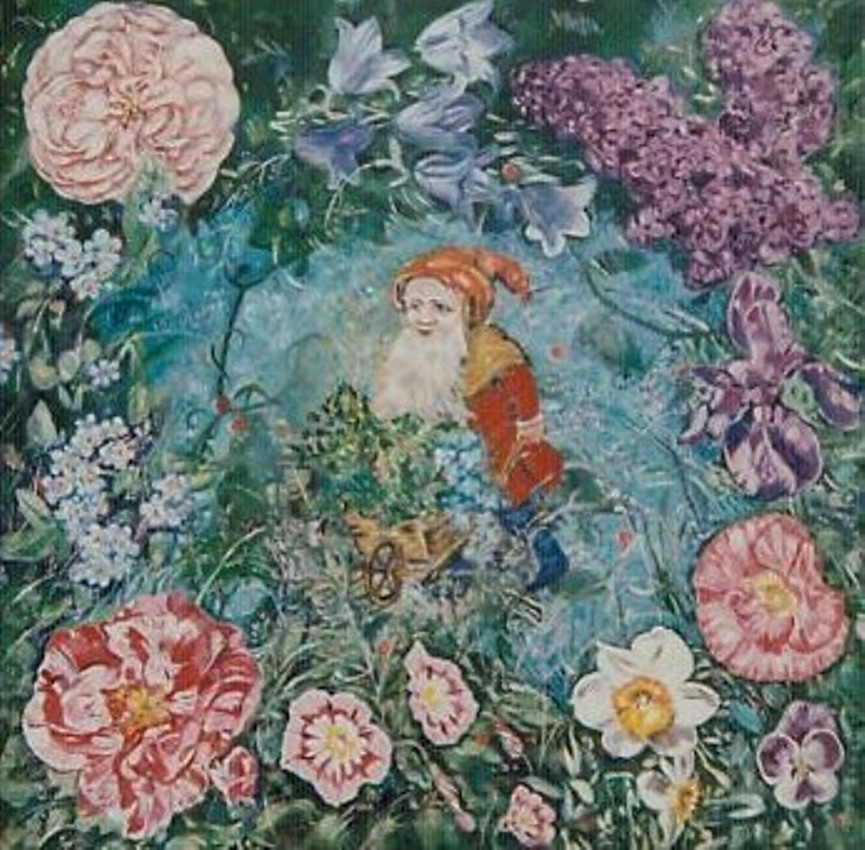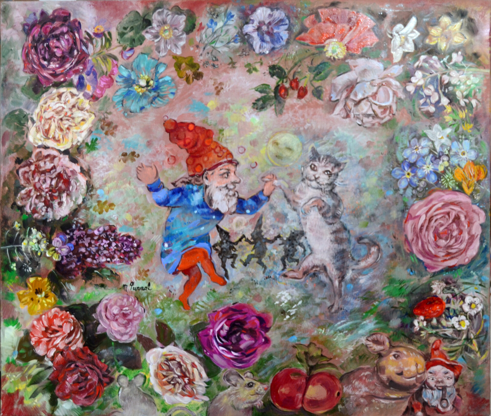 LE LUTIN AUX FLEURS, huile sur toile, 0,55m x 0,50m.