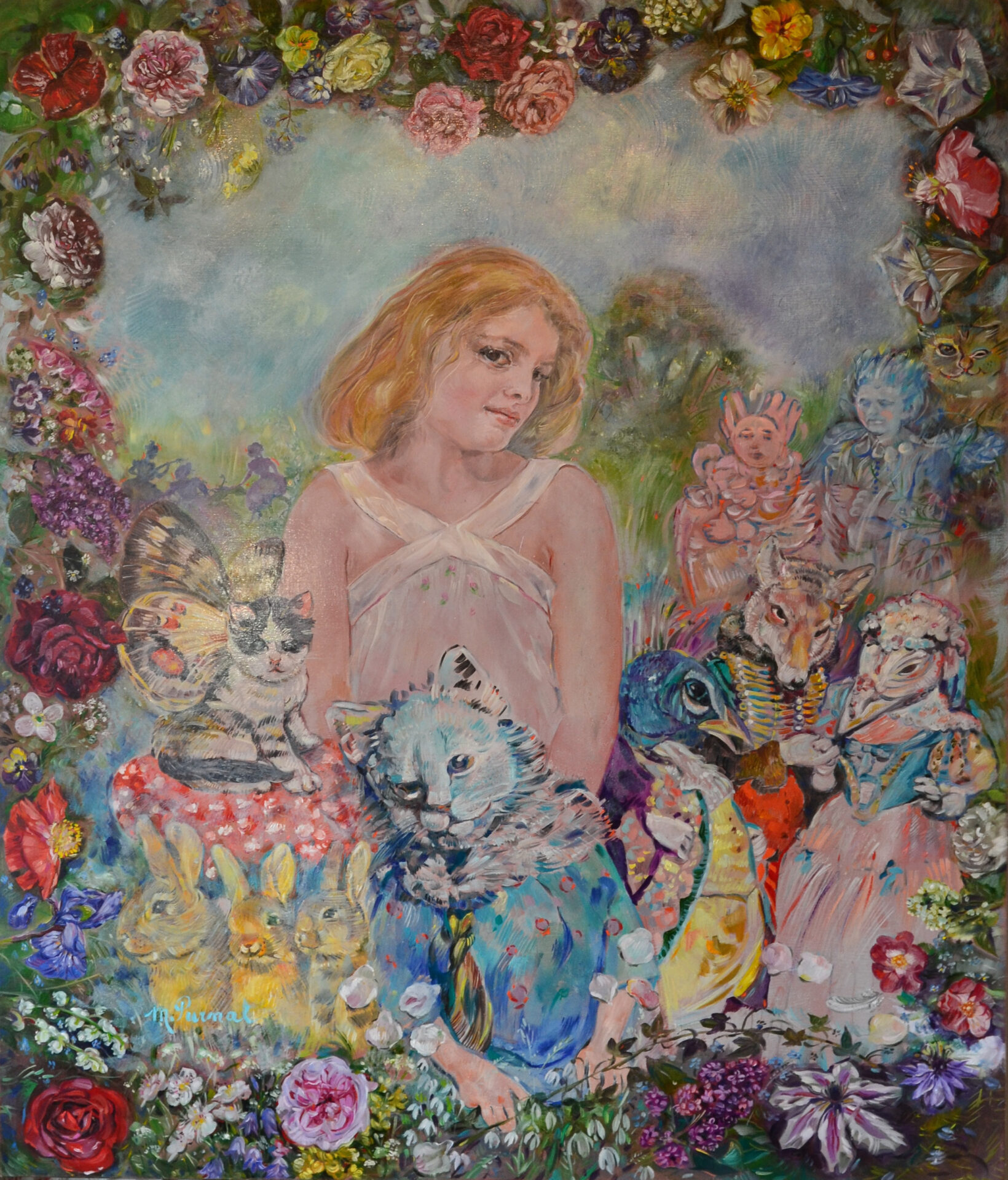 Michèle Purnal, " Un Après-Midi au Jardin ". Année 2016, Huile sur toile, 1,20m x 1,00m.