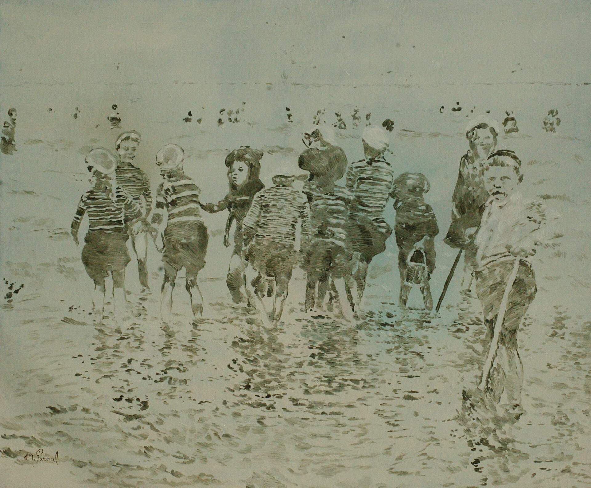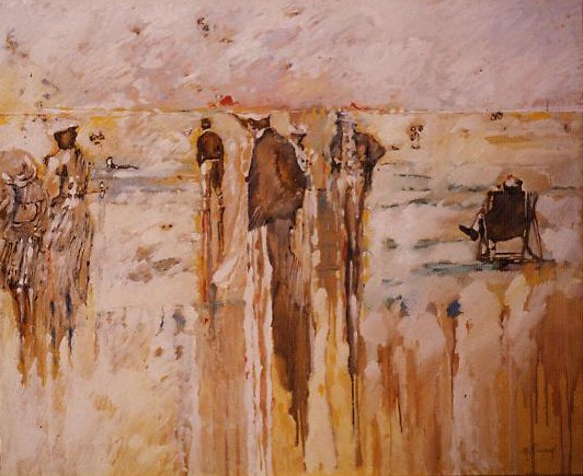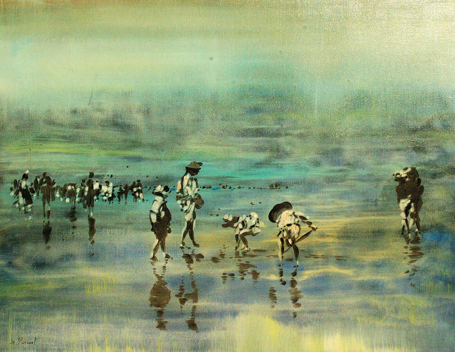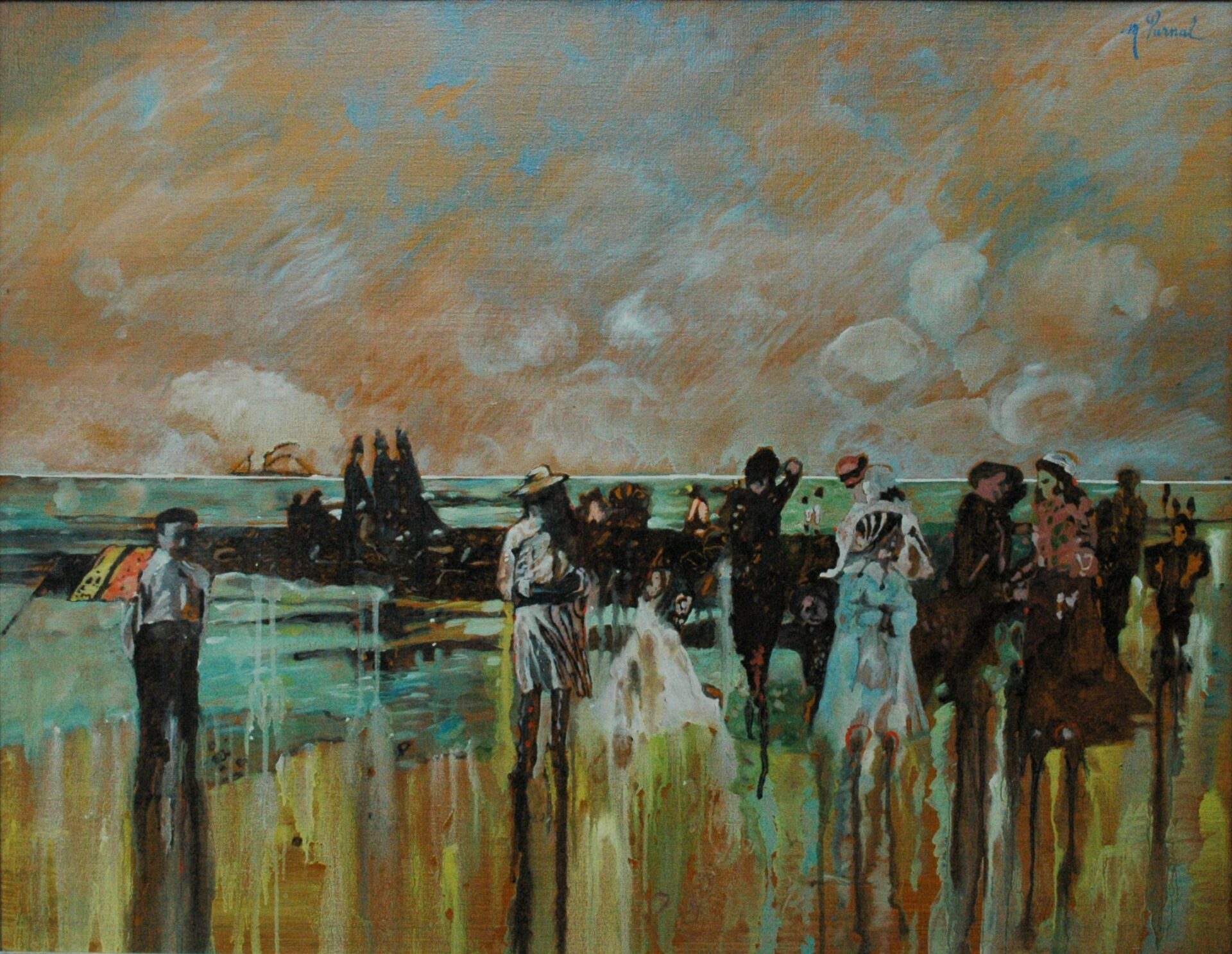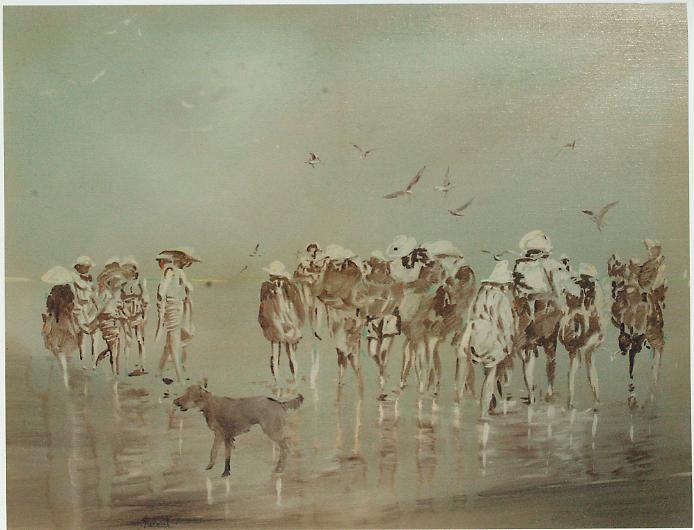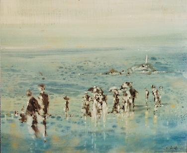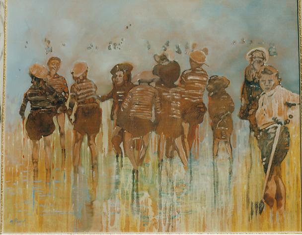 » Les Plages » Selon le peintre Michèle purnal, peuplées de silhouettes fusionnées au ciel comme à la mer .. Un moment suspendu ponctué d’êtres. Ombres se résumant en quelques taches blanches et sombres. Confondus en leur errante solitude. Non point de tristesse, ni de mélancolie… simplement une douce et charmante nostalgie..