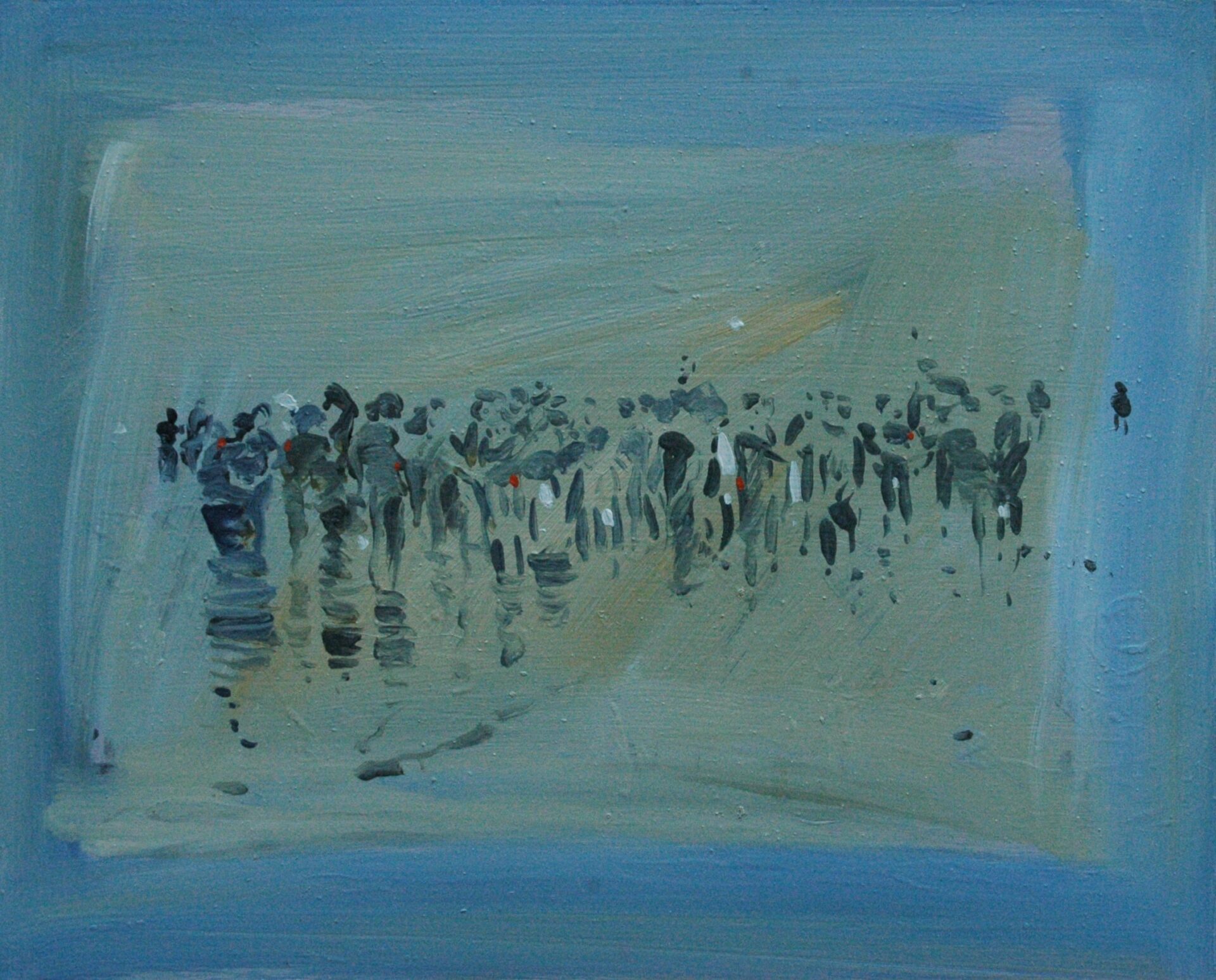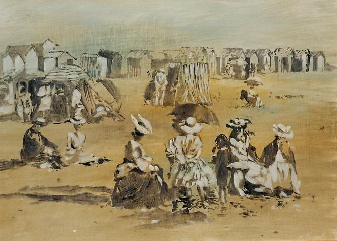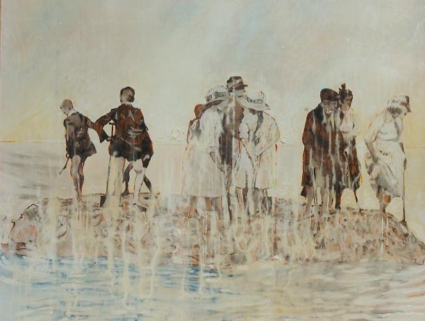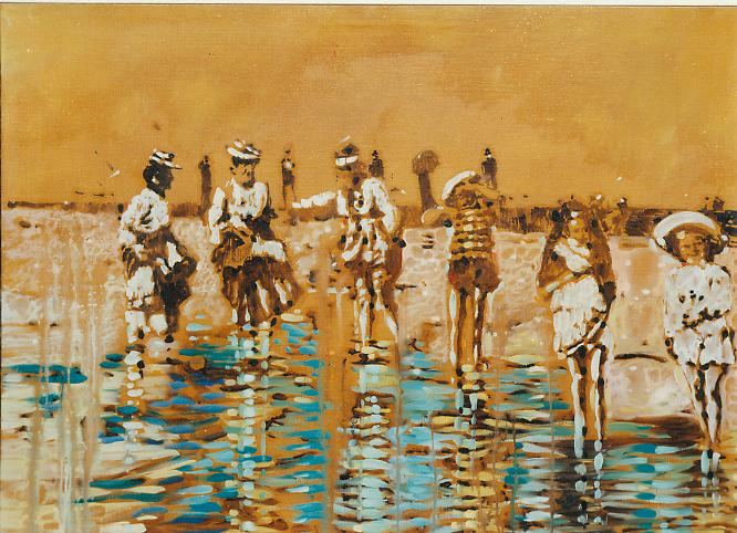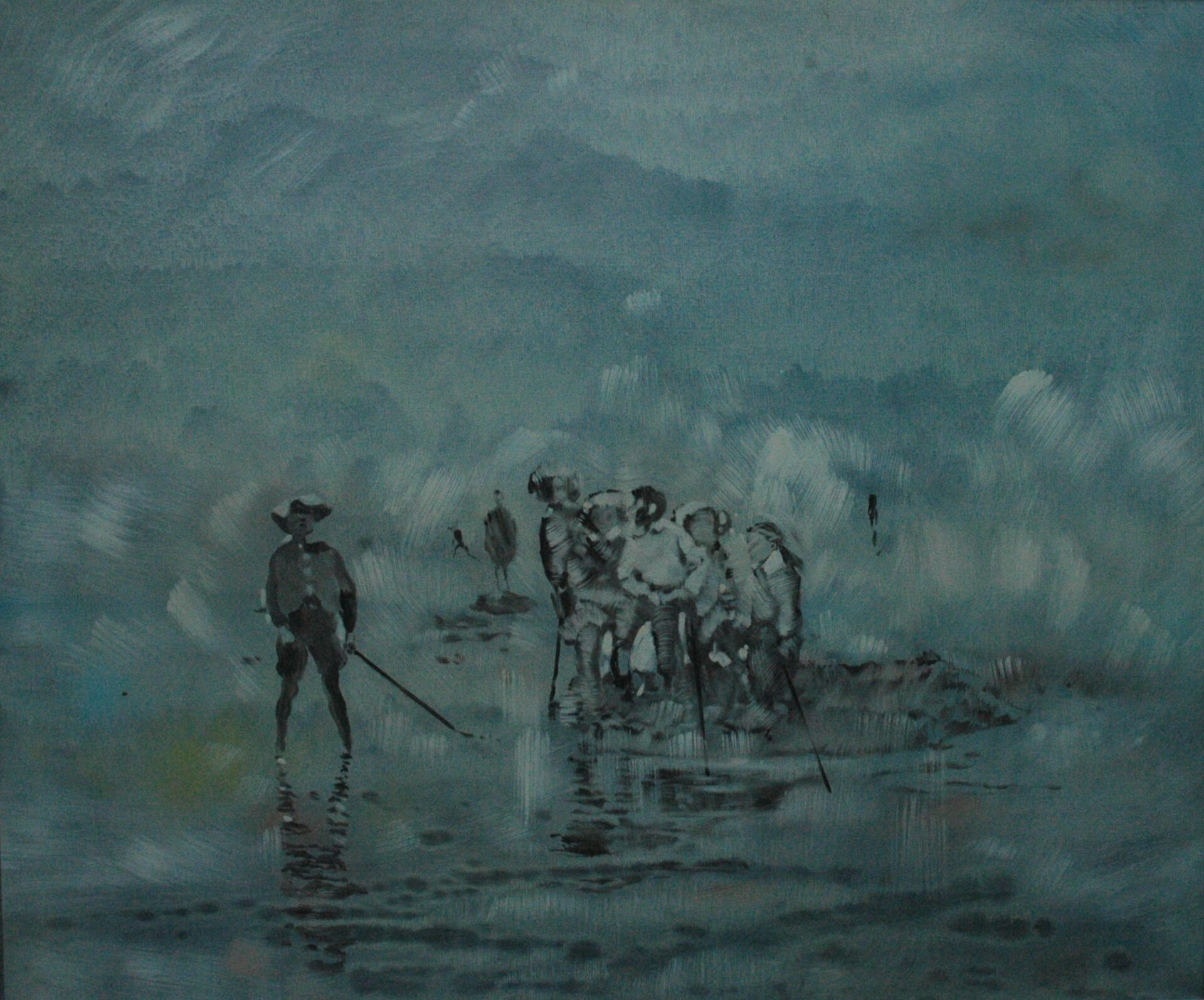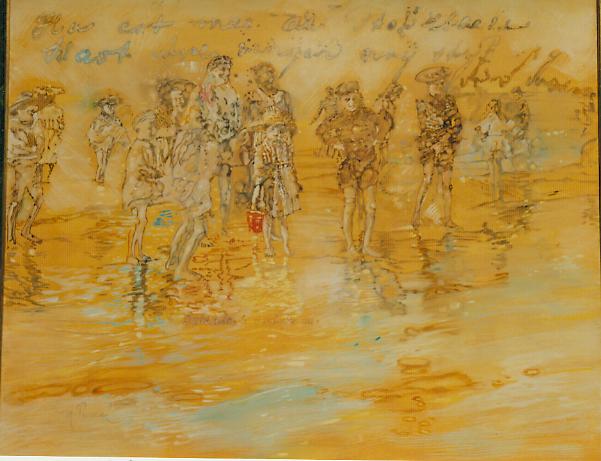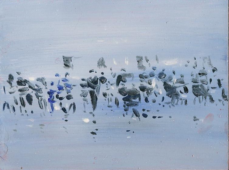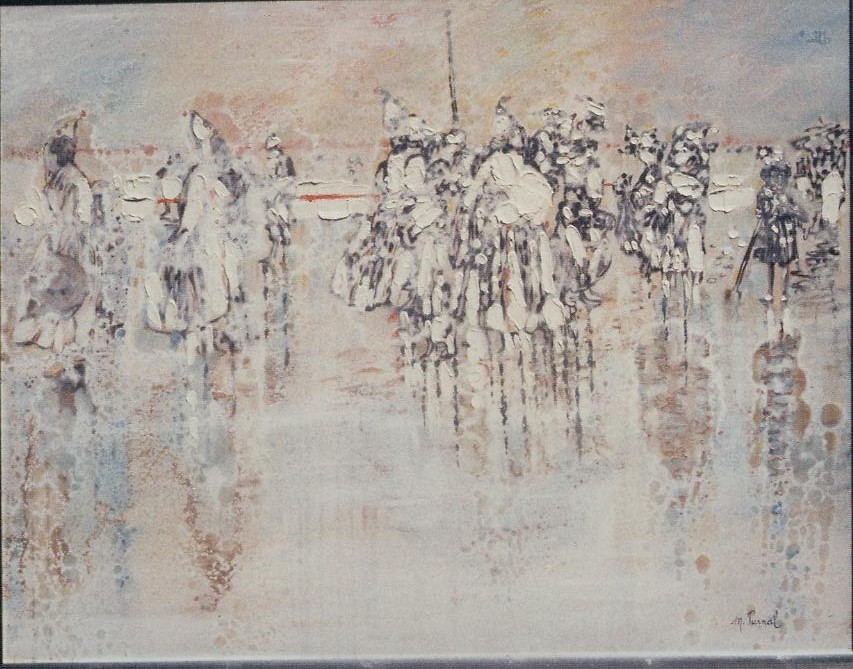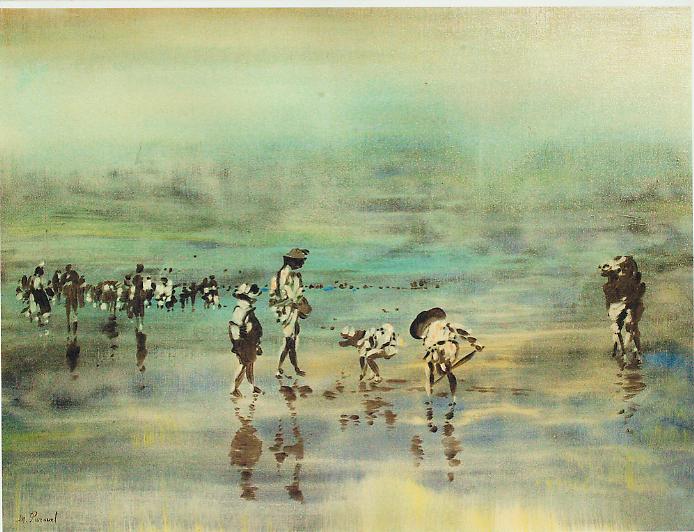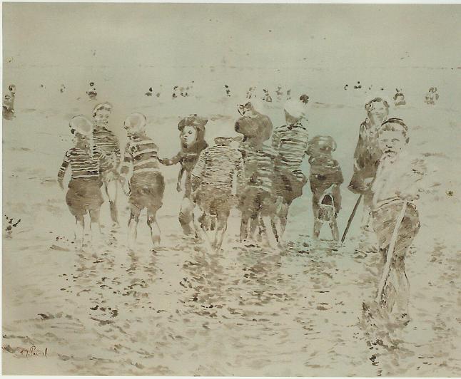 » Les Plages » Selon le peintre Michèle purnal, peuplées de silhouettes fusionnées au ciel comme à la mer .. Un moment suspendu ponctué d’êtres. Ombres se résumant en quelques taches blanches et sombres. Confondus en leur errante solitude. Non point de tristesse, ni de mélancolie… simplement une douce et charmante nostalgie..