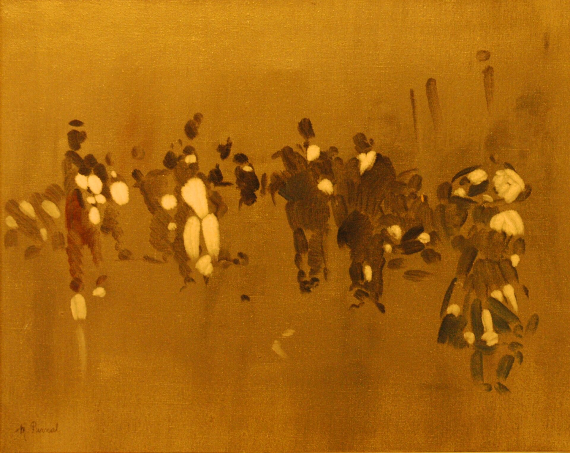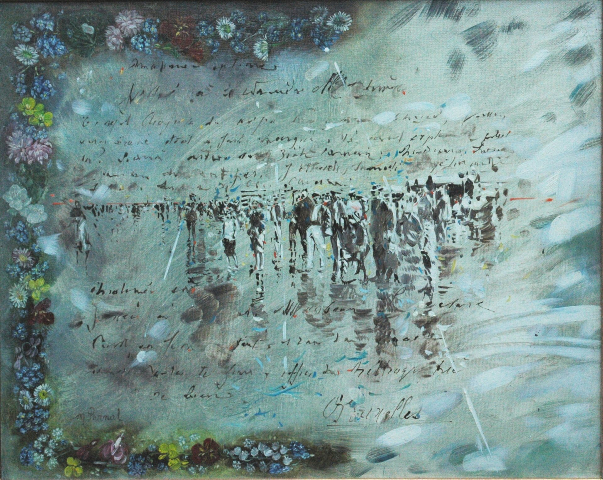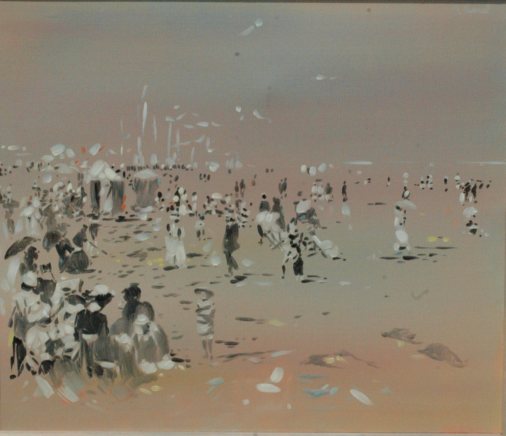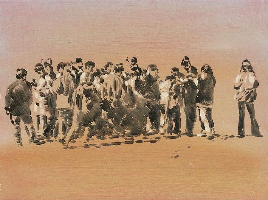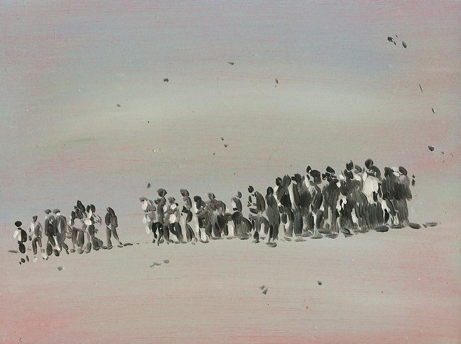 » Les Plages » Selon le peintre Michèle purnal, peuplées de silhouettes fusionnées au ciel comme à la mer .. Un moment suspendu ponctué d’êtres. Ombres se résumant en quelques taches blanches et sombres. Confondus en leur errante solitude. Non point de tristesse, ni de mélancolie… simplement une douce et charmante nostalgie..