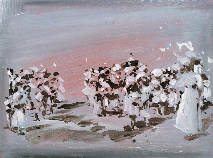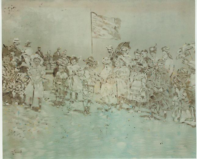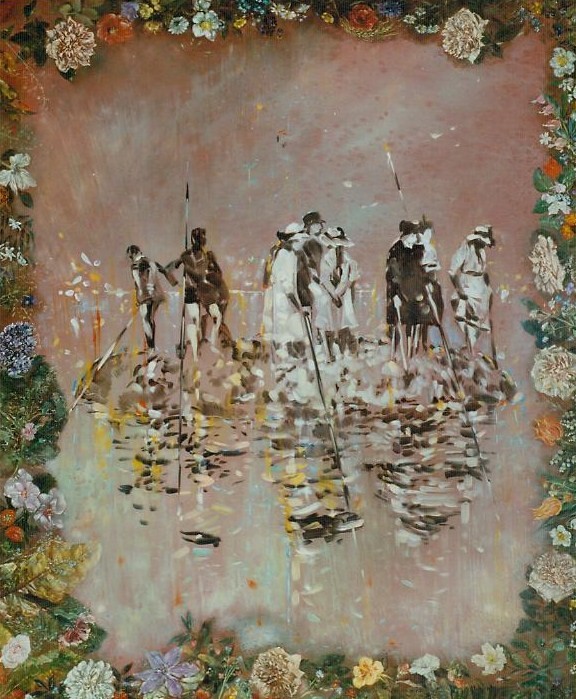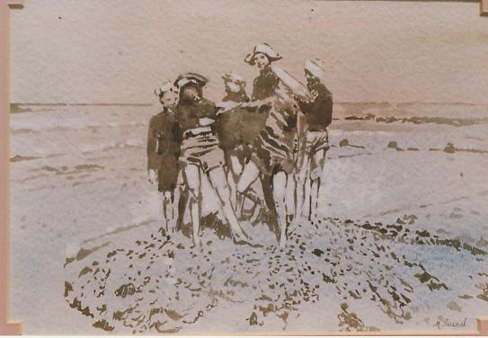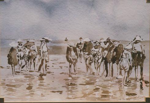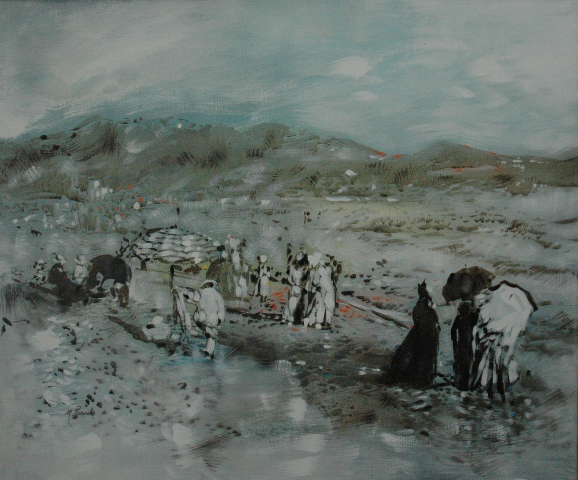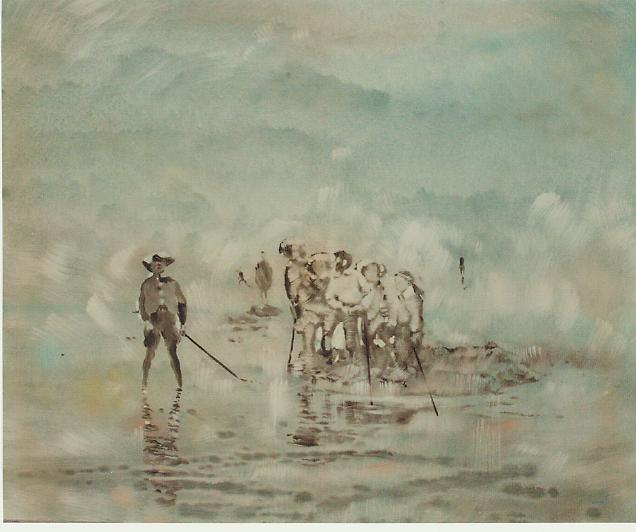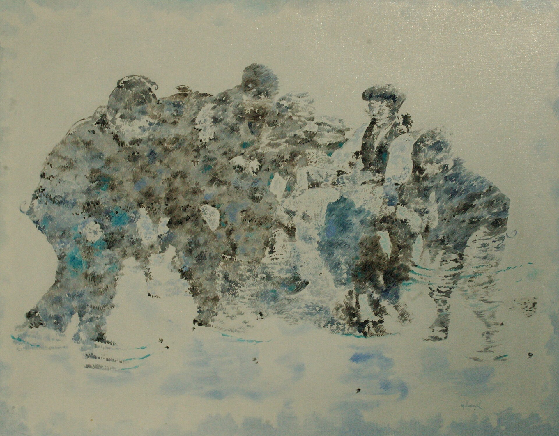 » Les Plages » Selon le peintre Michèle purnal, peuplées de silhouettes fusionnées au ciel comme à la mer .. Un moment suspendu ponctué d’êtres. Ombres se résumant en quelques taches blanches et sombres. Confondus en leur errante solitude. Non point de tristesse, ni de mélancolie… simplement une douce et charmante nostalgie..